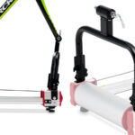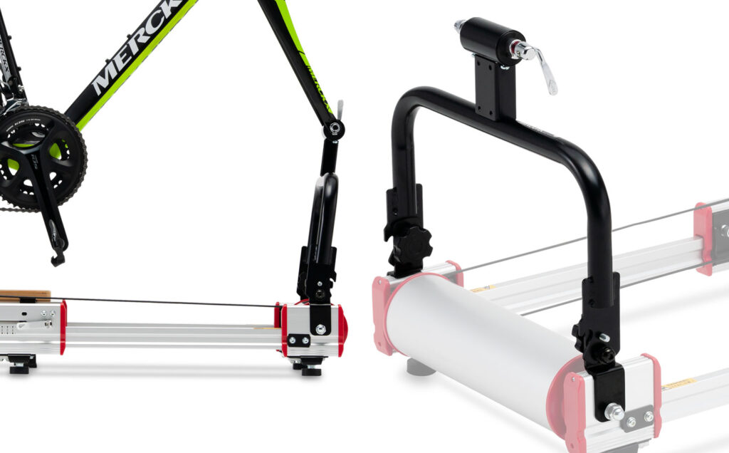- フォークスタンドを使わない通常トレーニングの際は、工具不要の簡単操作でスタンドを前方へ倒しておくだけなので、取り外す必要がありません。(前輪を装着した通常の3本ローラートレーニングができます。)